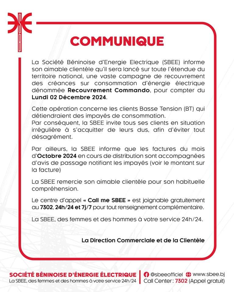 La Société Béninoise d’Énergie Électrique ( SBEE) projette une vaste opération de recouvrement dénommée » recouvrement commando ».