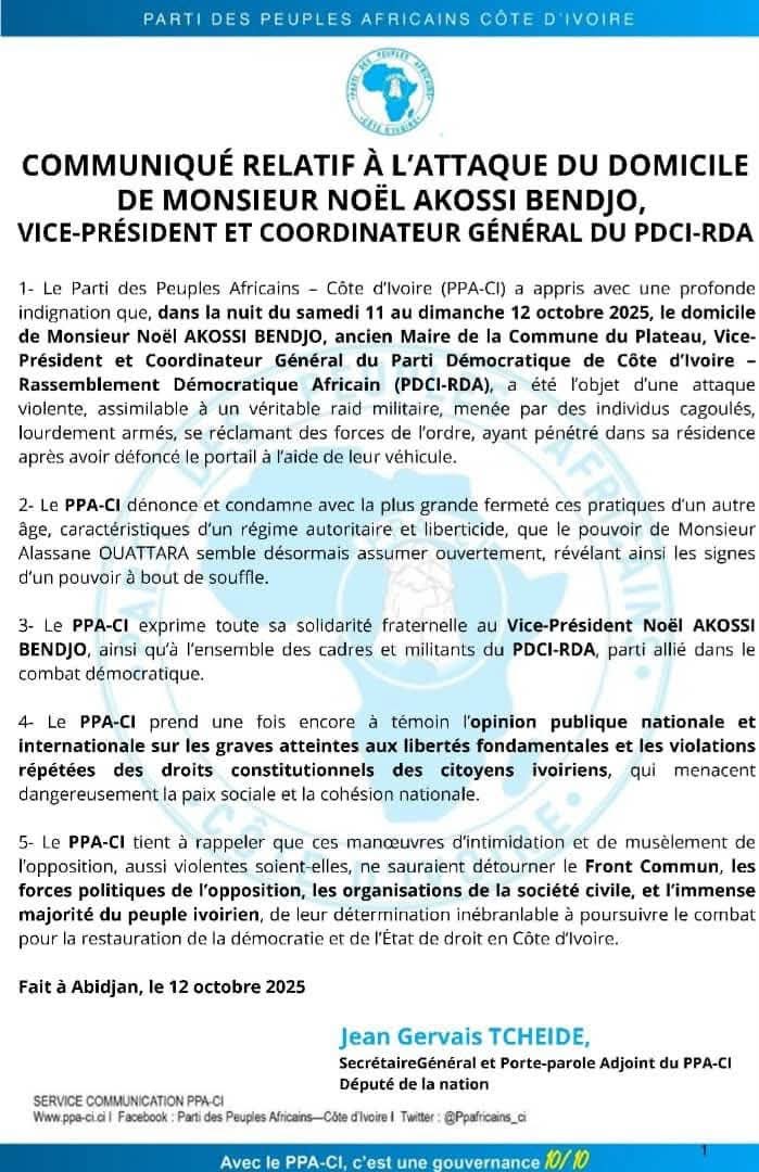 Dans la nuit du samedi 11 au dimanche 12 octobre 2025, le domicile de Noël Akossi Bendjo, vice-président du PDCI-RDA, a été attaqué par des hommes cagoulés et lourdement armés. Ils ont défoncé le portail avec un véhicule avant de pénétrer dans la résidence. Le Parti des Peuples Africains Côte d’Ivoire (PPA-CI) dénonce cette attaque qu’il qualifie de raid militaire et accuse le régime d’Alassane Ouattara de recourir à des méthodes autoritaires pour intimider l’opposition. Le PPA-CI exprime sa solidarité avec Noël Akossi Bendjo et l’ensemble du PDCI-RDA, tout en alertant l’opinion publique nationale et internationale sur la gravité des atteintes aux libertés et aux droits constitutionnels, qui mettent en danger la paix sociale en Côte d’Ivoire. Le parti rappelle que ces actions ne feront pas reculer ni le Front Commun ni les forces démocratiques et la majorité du peuple, déterminés à poursuivre le combat pour la démocratie et l’État de droit dans le pays.