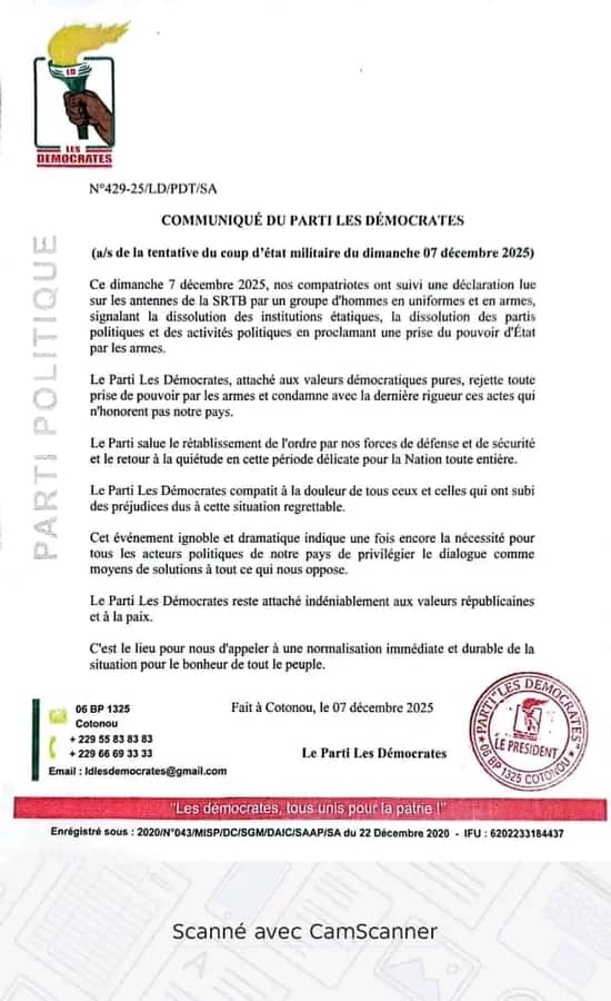 Le Parti Les Démocrates s’est officiellement exprimé après la tentative de coup d’État militaire survenue le dimanche 7 décembre 2025. Dans un communiqué rendu public,la formation politique a dénoncé avec fermeté cette prise de pouvoir avortée par les armes et a réaffirmé son attachement indéfectible aux valeurs démocratiques. Revenant sur les faits, le parti rappelle que ce jour-là, les Béninois ont suivi « une déclaration lue sur les antennes de la SRTB par un groupe d’hommes en uniformes et en armes, signalant la dissolution des institutions étatiques ». Face à cette situation jugée grave et dangereuse pour la stabilité nationale, Les Démocrates déclarent rejeter « toute prise de pouvoir par les armes » et condamnent « avec la dernière rigueur ces actes qui n’honorent pas notre pays ». Le parti a tenu à saluer la réaction rapide des forces de défense et de sécurité qui a permis d’éviter le pire et de rétablir l’ordre. Il souligne « le retour à la quiétude en cette période délicate pour la Nation toute entière ». Sensible aux conséquences humaines de cette tentative de déstabilisation, le parti a aussi adressé sa compassion aux populations affectées, affirmant qu’il « compatit à la douleur de tous ceux et celles qui ont subi des préjudices ». Pour Les Démocrates, cet épisode dramatique doit servir de leçon forte à toute la classe politique. Le parti estime qu’il s’agit d’un signal clair en faveur du dialogue, qu’il considère comme la seule voie crédible pour résoudre les différends politiques. Il rappelle ainsi que « la nécessité pour tous les acteurs politiques de privilégier le dialogue comme moyen de solutions à tout ce qui nous oppose » est devenue plus que jamais une urgence nationale. Résolument tourné vers la paix et la République, le parti réaffirme pour finir qu’il reste « attaché indéniablement aux valeurs républicaines et à la paix » et appelle à « une normalisation immédiate et durable de la situation pour le bonheur de tout le peuple ».