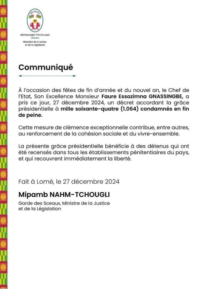 Ci-dessous, le communiqué du Garde des sceaux ministre de la justice et de la législation, Mipamb Nahm-Tchougli, qui a annoncé cette décision du Chef de l’état.