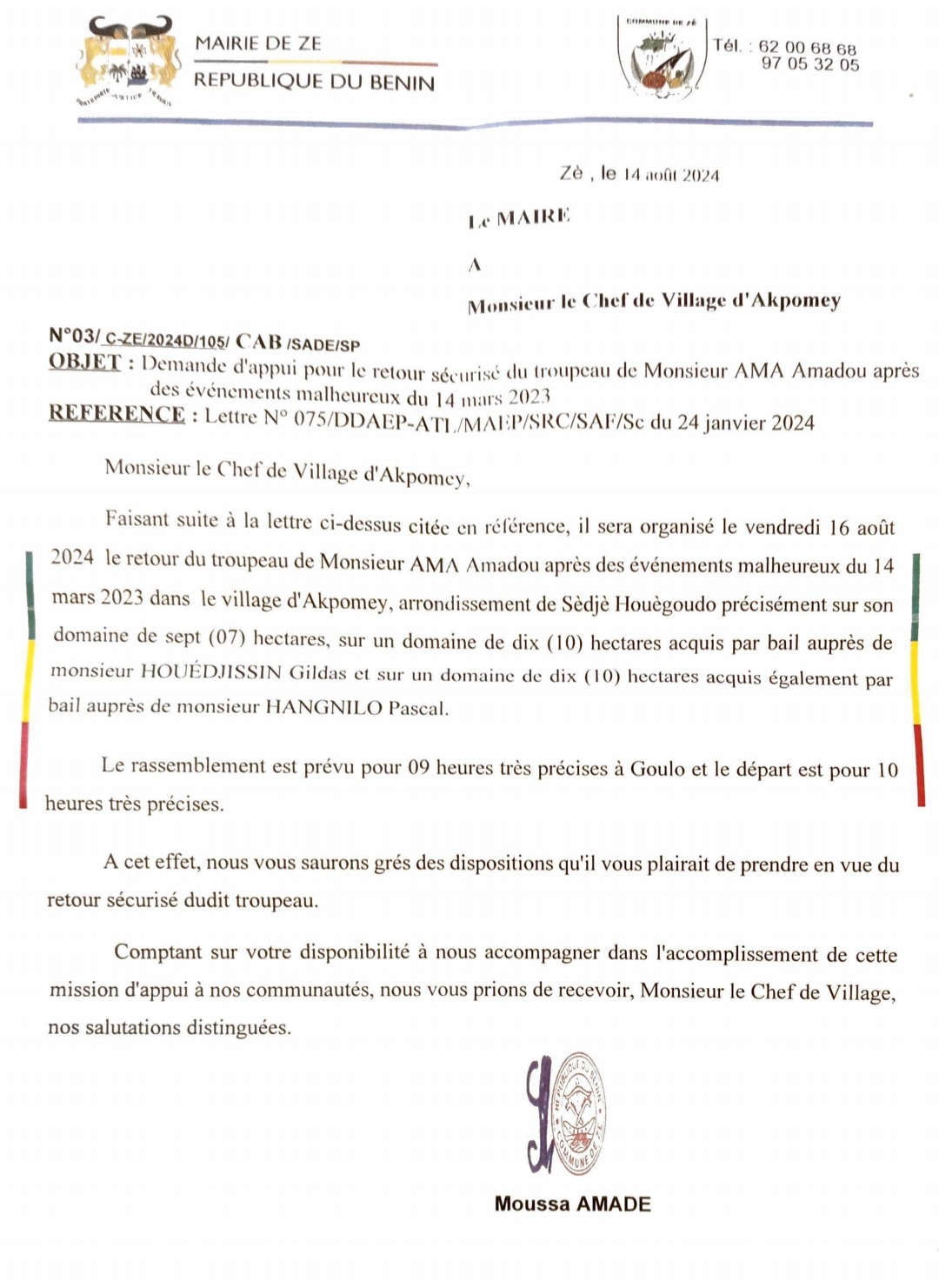 Le conflit ne date pas d’hier. En mars 2023, le chef du village avait alerté le maire de Zè sur les dommages causés par ces animaux. En réponse, le maire avait ordonné le retour du troupeau d’Ama Amadou hors du village, afin de protéger les terres agricoles des villageois. Un retour avait même été organisé le vendredi 16 août 2024, après des incidents survenus en mars 2023, où les bœufs avaient ravagé les cultures sur plusieurs hectares de terres louées.