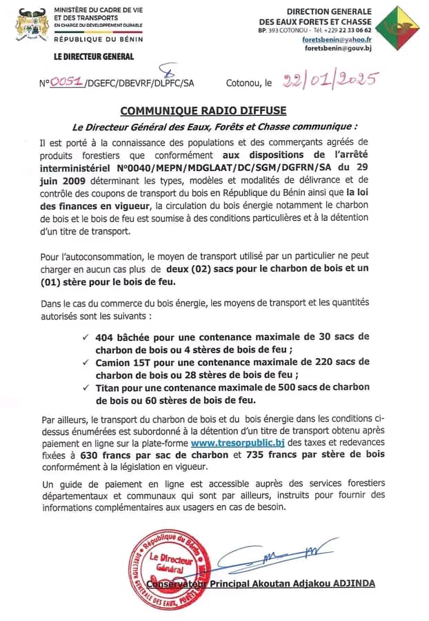 Il est à notifier que le transport du charbon de bois et du bois énergie est dorénavant « subordonné à la détention d’un titre de transport obtenu après paiement en ligne sur la plate-forme www.tresorpublic.bj des taxes et redevances fixées à 630 francs par sac de charbon et 735 francs par stère de bois conformément à la législation en vigueur », informe le communiqué.