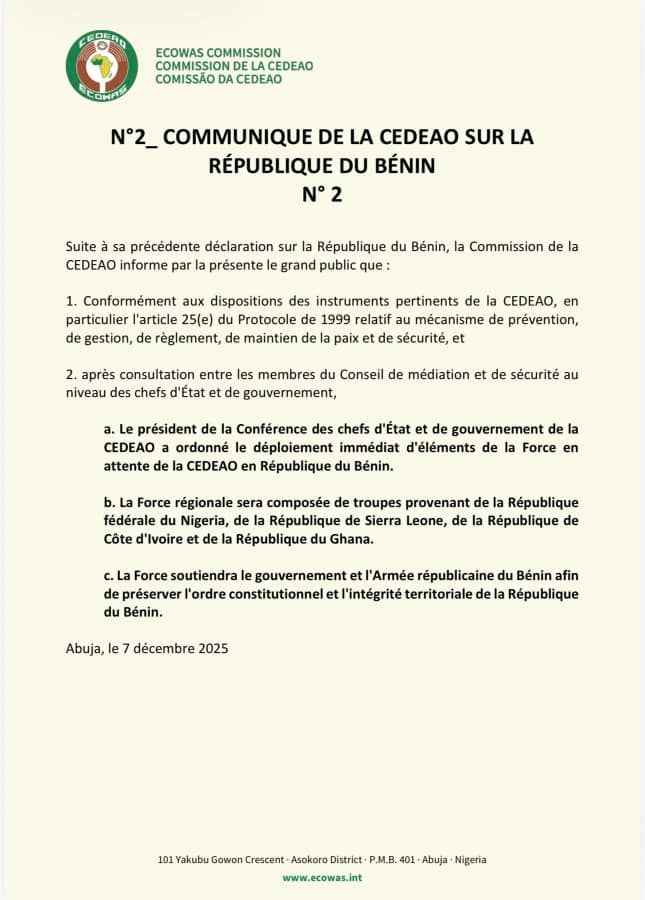 Urgent: La CEDEAO déploie sa force en attente au Bénin.