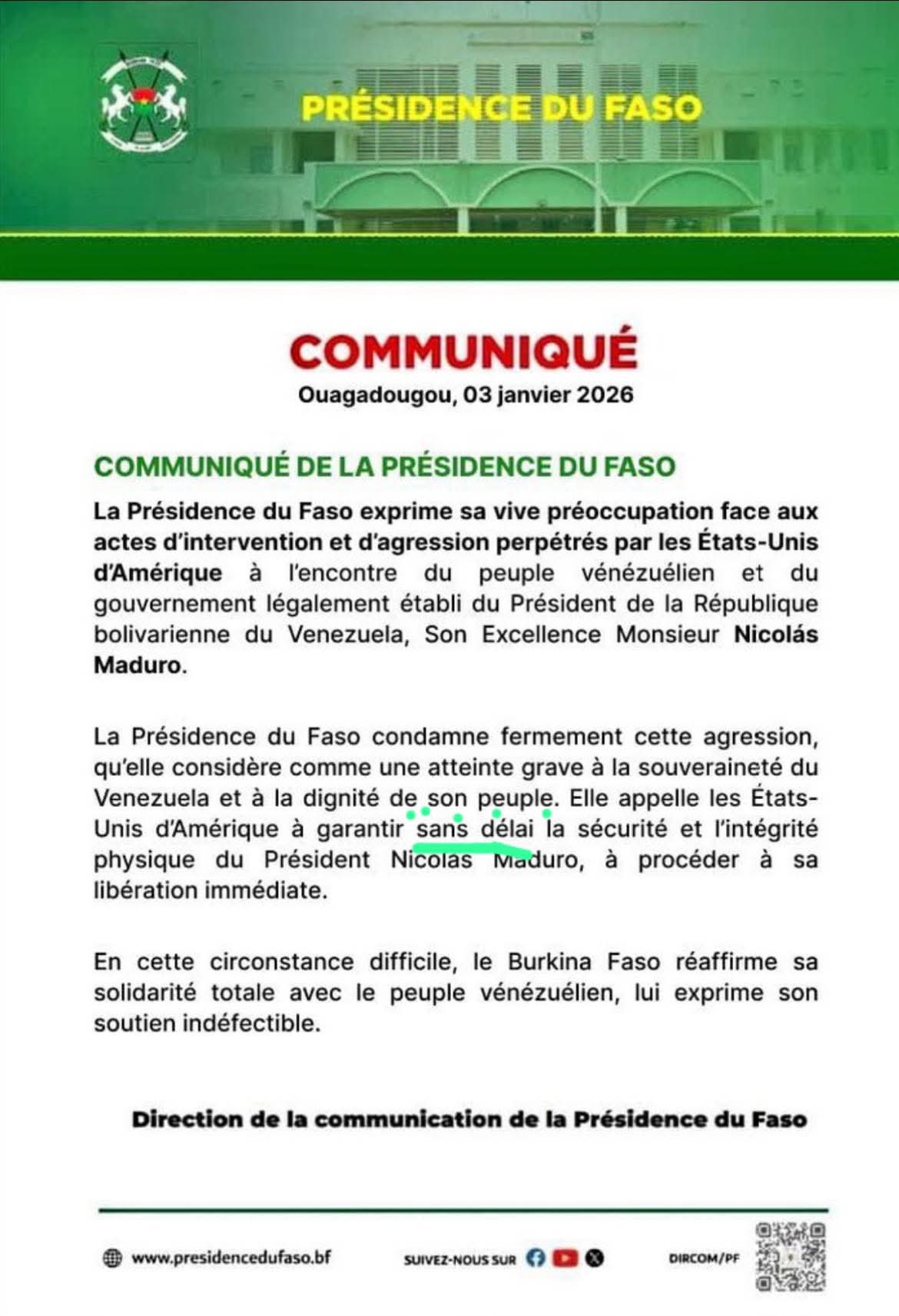 Par un communiqué daté du 3 janvier 2026, la Présidence du Faso s’est prononcée sur les événements survenus au Venezuela. Elle dénonce des actes « d’intervention et d’agression » des États-Unis contre le président Nicolás Maduro et son gouvernement.