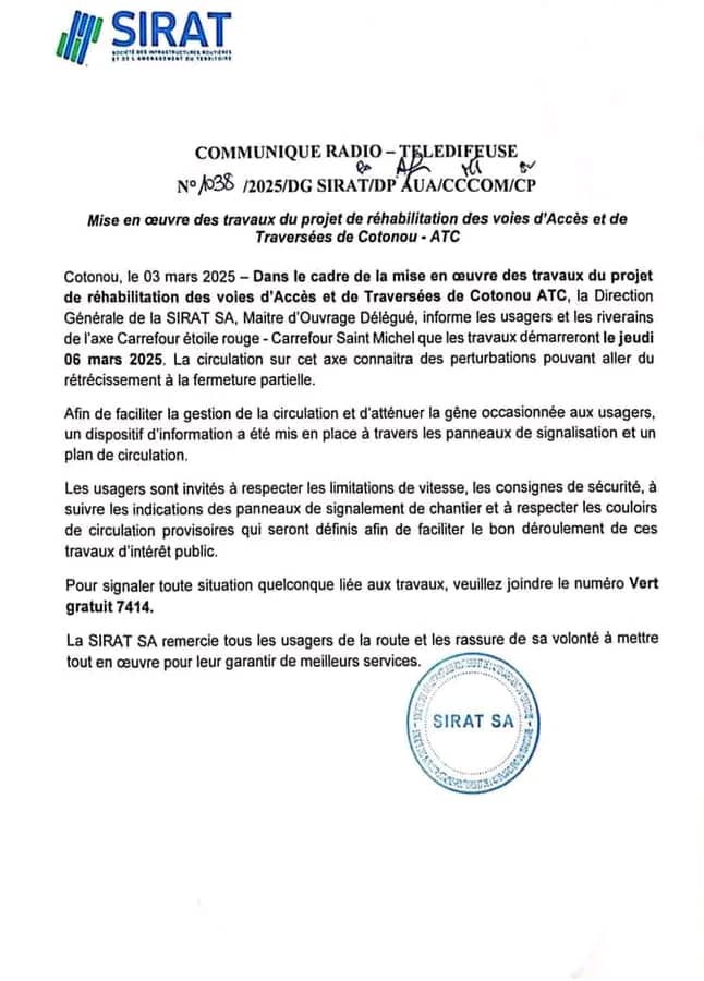 Ce changement intervient dans le cadre de la mise en œuvre du projet de réhabilitation des voies d’Accès et de Traversées de Cotonou ATC.