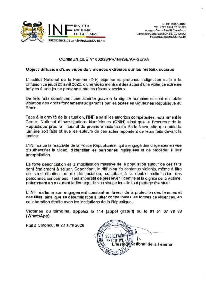 La scène a fait le tour des réseaux sociaux très tôt ce jeudi 23 avril 2026. L’Institut national de la Femme (INF), à travers un communiqué, a salué la promptitude de la Police républicaine ainsi que la forte mobilisation pour permettre de rattraper les auteurs ou complices d’un tel acte.